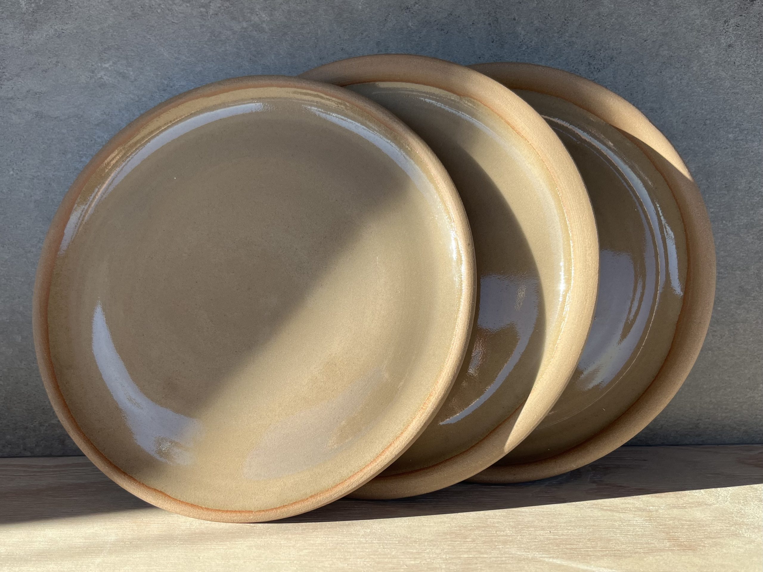 Dieser kleine Teller wird aus braunem Ton gedreht und mit einer transparenten, glänzenden Glasur auf der Telleroberseite gebrannt. Der äussere Rand und die Unterseite des Tellers bleiben dabei unglasiert und der schöne Kontrast zwischen glasiertem und unglasierten Ton wird auf diese Weise sichtbar. Jeder Teller ist ein Unikat und leichte Abweichungen in der Glasur und Form sind durch Handarbeit entstanden.
