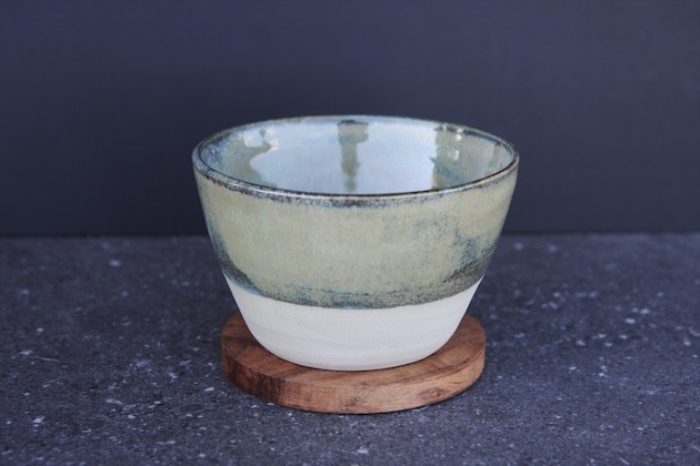 Eine aus hellem Ton gedrehten Schale, die mit einer jade- bis dunkelgrünen Glasur glasiert wurde. Der Gegensatz zwischen glasiertem und unglasiertem Ton kommt hier besonders zur Geltung. Jede Schale ist ein Unikat. Volumen 300ml